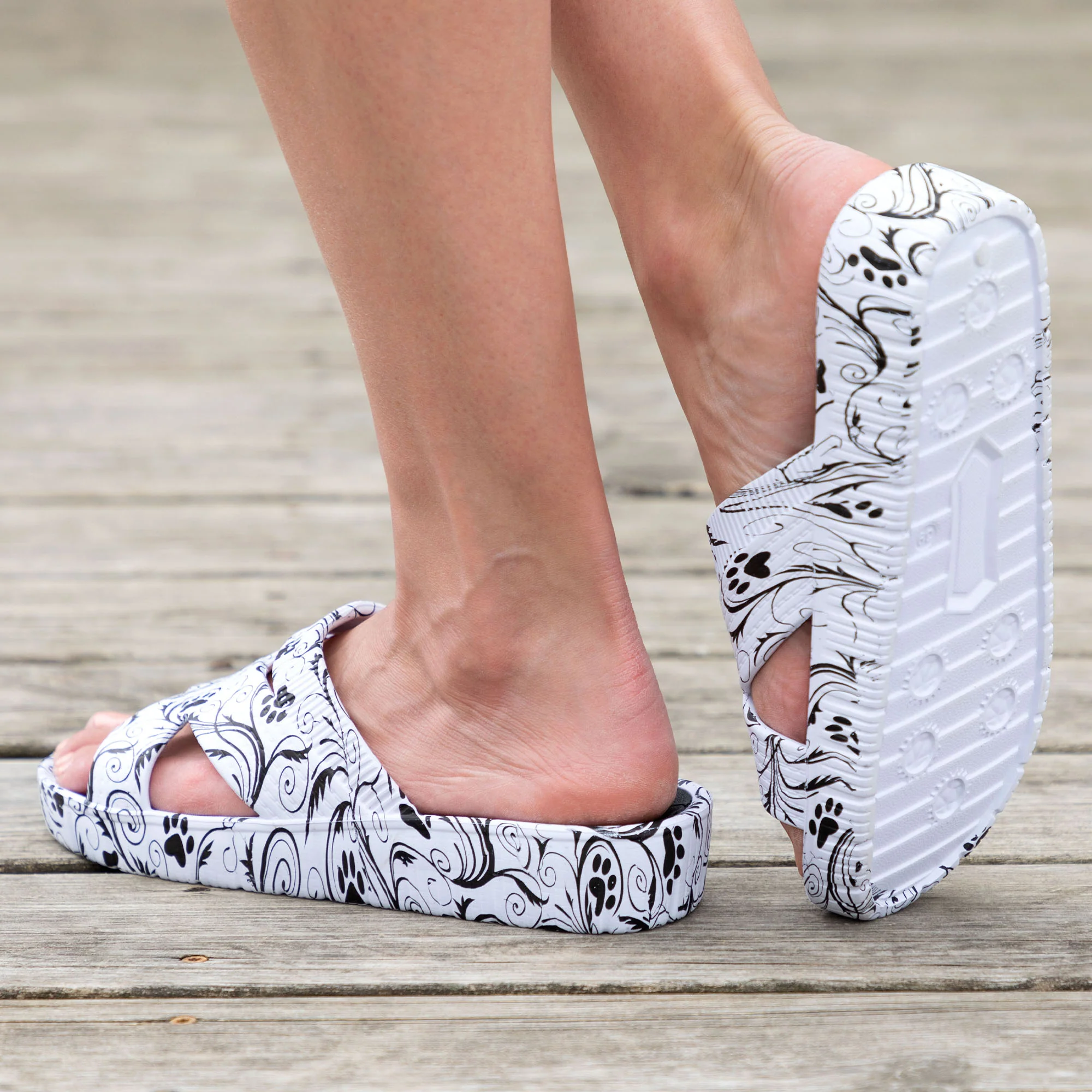 With a textured footbed and strappy slip-on design, this lightweight pair is the perfect warm weather sandal! Easy on, and overflowing with paw prints in vibrant colors, these charming sandals support for animal causes while also providing all day comfort.