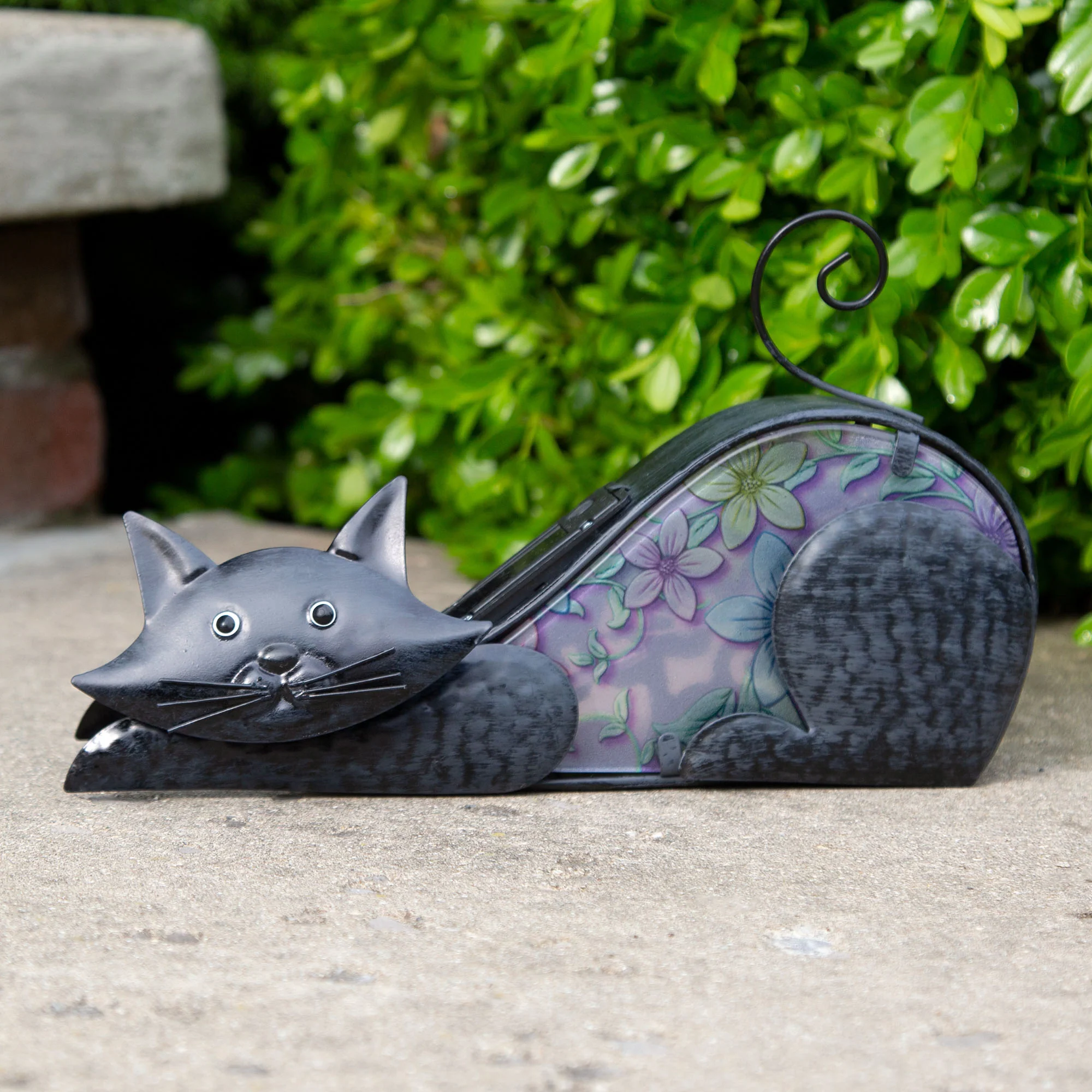 While the solar panel charges during daylight hours, the silhouette of a sitting pup or a cat stretching is a playful decorative piece! A beautiful blend of dark metal and floral frosted panels is a sweet addition to your outdoor space during the day, before it lights up and softly glows in the night.