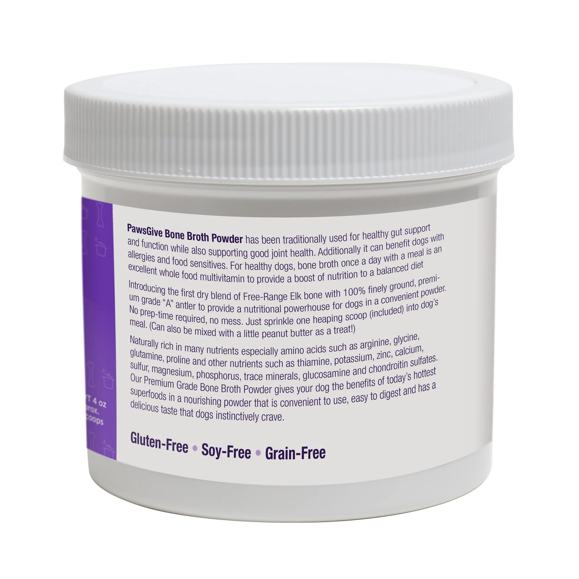PawsGive Bone Broth Powder has been traditionally used for healthy gut support and function while also supporting good joint health. Additionally it can benefit dogs with allergies and food sensitives. For healthy dogs, bone broth once a day with a meal is an excellent whole food multivitamin to provide a boost of nutrition to a balanced diet.